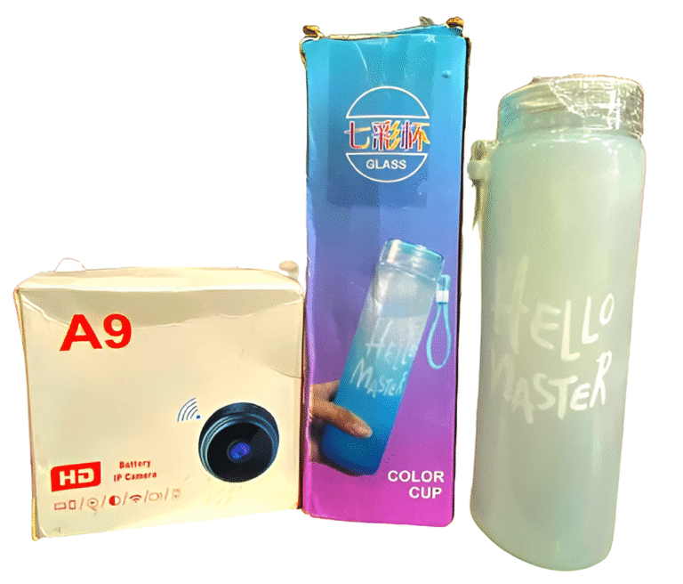 Deal pack of 2 – A9 Mini Camera & Frosted Glass Water Bottle (Random color)